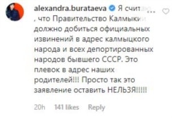"Я считаю, что Правительство Калмыкии должно добиться официальных извинений в адрес калмыцкого народа и всех депортированных народов бывшего СССР. Это плевок в адрес наших родителей!!! Просто так это заявление оставить НЕЛЬЗЯ!!!!!" – написала она под постом Хасикова (её комментарий собрал множество лайков).
