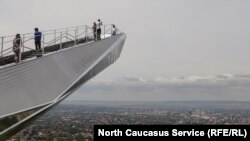 Немногочисленные посетители смотровой площадки "Лестница в небеса", которая недавно появилась в Грозном.