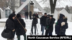 Журналистка и автор книги про историю Махачкалы "Был такой город" Светлана Анохина пришла на акцию протеста с наградной медалью от Правительства Дагестана.